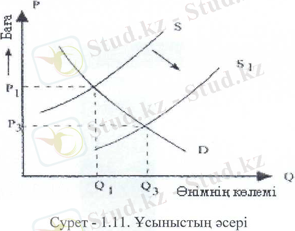 Тауарлар ұсынысына әсер етуі екінші вариантында көруге болады. Өндірілетін өнімнің саны (І орнатылған, және оның қандай бағасында сатылатынын кәсіпорындар талап етеді. Өйткені шығындары төмен болады, талап етілетін Р2 бағасы да төмен болады (сурет - 1. 3. ) .