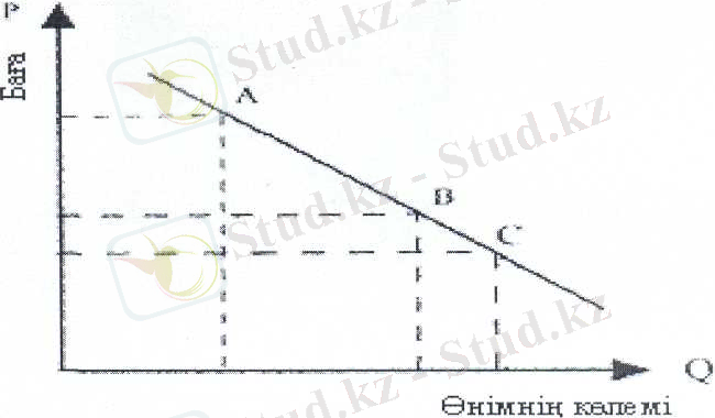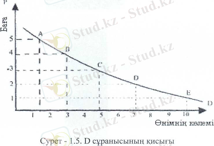 2. 1 суреттен көретініміз, шұжықтың бағасы 500-ден 600 тг дейін өскенде, сұраныс көлемі 5, 5-тен 5 кг-ға дейін төмендейді, қозғалыс сұраныс қисығының бойымен А нүктесінен В нүктесіне дейін болады. Осы келтітілген мысалымызда тауардың бағасы мен сұраныс көлемінің арасындағы байланысты зерттедік, онда сұранысқа ықпал ететін басқа факторлар өзгермейді деп ұйғардық. Оны математика тәсілімен көрсетсек сұраныс функциясы деп атаймыз және ол төмендегідей түрде жазылады.