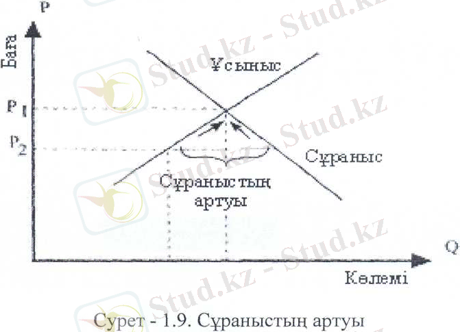 Егерде нарықтық бағасы теңдестік бағасынан төмен болса, онда сұранысы жоғарылайды, және көп өндірудің арқасында көп ала бастайды. Бұл жағдайда, сұраныс пен ұсыныс теңдестік өыдірушілері мен тұтынушыларының келісіміне келгенше, сұраныстың қисығы бойынша жоғарыға ығысуы жүріп отырады және бағаның жоғарылауын болдыратын, «сұраныстың артуы» пайда болады (сурет - 1. 9. ) .