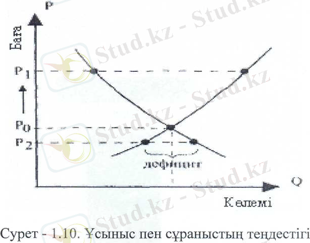 Егерде баға Р2 болса, онда дефициті даи береді, өйткені тұтынушылары қанша тауарды алғысы келсе, сонша тауарды ала алмайды. Бү_л бағаның жоғарылауына және дефициті жоқ сұраныстың төмендеуіне әкеледі. Өндірушілері ендірістің кеңеюуі мен бағаның жоғарылауына көңіл аударады, ал тұтынушылары бір-бірін айналып өтуге және тауарды сатып алуға тырысады.