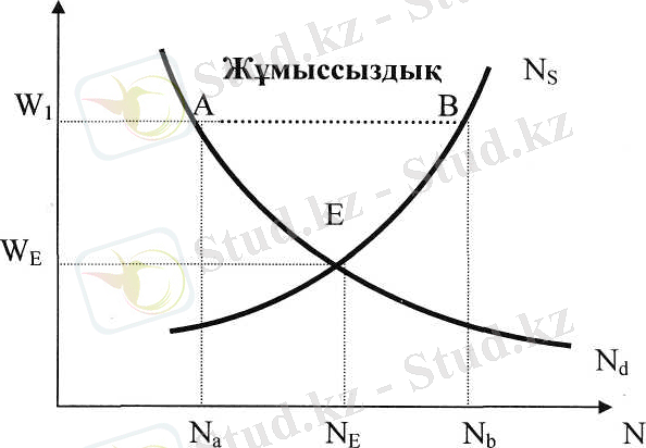 Бұл суреттен көретініміз еңбек сұранысы қисығы N d менеңбек ұсынысы қисығы N s қиылысында Е нүктесі пайда болады, ол нүкте еңбек рыногындағы тепе-теңдікті сипаттайды. Осы тепе-теңдік нүктеге сәйкес W E нақты жалақының және N E жұмысбастылық деңгейінің тепе-теңдігі шығады. Егер жалақы W 1 деңгейде жоғары болса, онда рыноктық сәйкессіздік нәтижесінде ұсынылатын еңбек көлемі еңбекке сұраныстан В-А мөлшерде өседі, осының нәтижесінде N b -N a мөлшерде экономикада жұмыссыздық пайда болады. /7/