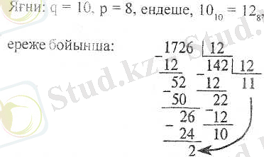 2) Бүтін сандарды бір негізден екінші негізге көшіру. Бұл есепте р < q, ендеше ең алдымен q-ді р санау негізіне көшіру ушін жоғарыдағы ережені пайдалану керек, есептеулер р негізінде жүргізілуге тиіс.