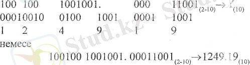 Мұнда санның басынан бастап әрбір цифрын екілік жүйеде жазып шығамыз, жоғарыда айтылған ережеге сүйенсек, санның алдындағы, соңындағы нөлдерді жазбауға болады, ендеше,