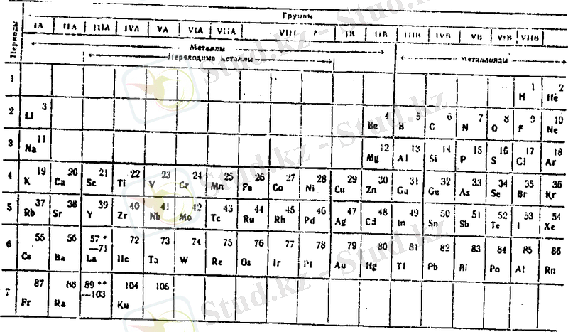 Металдардың сипаттамасы. Табиғи жағдайда кездесетін 92 элементтің 70-ке жуығы металдарға жатады. Металл еместерге Н, В, С, N, O, иннерті газдар He, Ne, Ar, Kr, Xe, Rn, галогендер F, Cl, Br, J және Si, P, S, сияқты элементтер жатады. Периоттық системада (1-кесте) сынық сызықтың оң жағында метал еместер, ал сол жағында металдар орналасқан. Бірақ элементтерді металдар мен метал-лойдтарға бөлу жеткіліксіз, өйткені олардың барлық ерекшеліктері ескерілмейді. Кеибір элементтер (мысалы Sn ) бір аллотропиялық түрінде металдық, ал басқа бір түрінде бейметалдық қасиет көрсетеді. IVB, VB және VIB тобына кіретін элементтердің ішінде металдар мен метал еместердің ортасында жататын жартылай металдар. (жартылай өткізгіштер) бар. Оларға Si, Gt, Fs, Se, Te, α-Sn жатады.