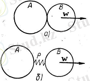 31-сурет. А денесі В денесін итеріп оған w үдеуін береді. Сонда осы денелердің арасындағы пружина жиырылады.