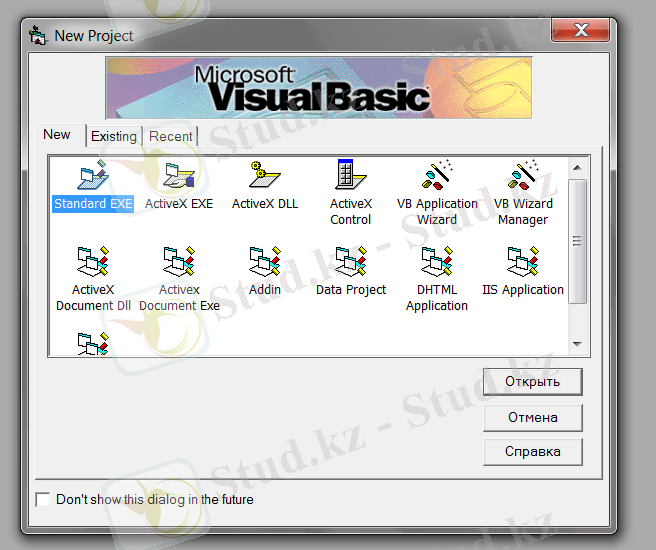 Пуск- Visual Basic. Visual Basic -ті іске қосқанда экранда Project Wizart жобаларының менеджері өзінің New Project терезесімен пайда болады. Терезе үш қосымша беттен трады: New-Жаңа жобалар, Existing-Қолданыстағы жобалар, Recent-Жақында пайдаланылған жобалар(1-сурет) . New қосымша бетінде жаңа қолданба үшін шаблон