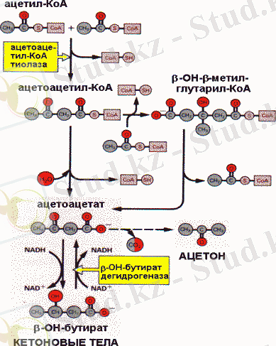 Бауырдағы β - тотығу нәтижесінде түзілген ацетил-СоА-ның кейінгі негізгі пайдаланылатын жолы - кетон денелерінің синтезі. Ол келесі ретпен жүреді: екікөміртекті молекула бір бірімен кейінгі реакцияларда ацетоацетат және β -гидроксибутират түзілуімен конденсацияланады.