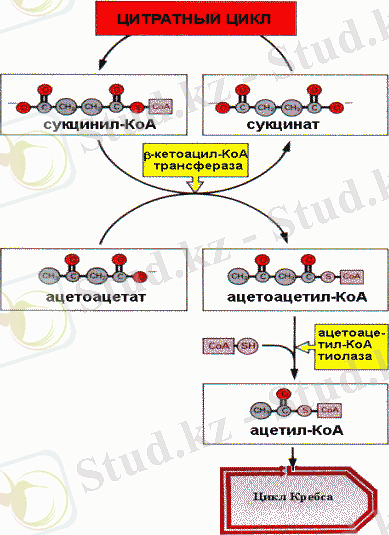 Бұл екі қышқыл кетонды денелер деп аталады. Кетонды денелер қанға диффундирлейді және бауыр ұлпаларынан басқаларымен энергия көзі ретінде пайдаланылады. Кетон денелерінің қандағы қалыпты концентрациясы 2 мг/л. Кетонденелерінің синтезін катализдейтін ферменттер митохондрияда орналасқан. Бауырда май қышқылдарының интенсивті тотығуы арнайы метаболитикалық жағдайларда жүрген кезде, біршама мөлшерде кетон денелері түзіледі. Бұл көмірсуарды пайдалану қиын жағдайда, анығырақ айтқанда организм үшін энергия көзі май қышқылдары (бұлшықеттің ұзақ жұмыс істеуі, ашығу, қант диабеті) болған кезде жүреді. Кетон денелерінің синтезделу жылдамдығы оларды ұлпаның пайдалануынан жоғары болып, қорға жинақталуына әкелуі мүмкін. Кетон денелерінің концентрациясының біршама жоғарылауы кетоацидоз (кетоз) деп аталатын қауіпті жағдай тудырады. Патологиялық кетоацитоз кезінде ацетоацетат ферментсіз декарбоксилденеді, ол ацетонның түзілуімен жүреді, сондықтан кетоз үшін ацетонның иісі тән.