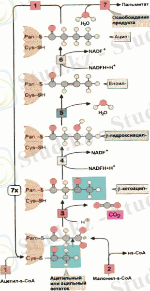Процесс клетканың әр түрлі бөліктерінде өтеді. Цитоплазмада С16 дейінгі (пальмитин) көміртегі тізбегі бар қаныққан май қышқылдары синтезделеді.