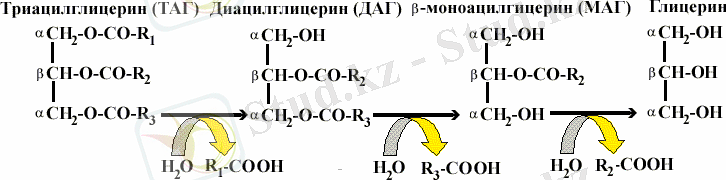 Майлардың гидролизі майдың тамшысының бетінде сорбцияланып, триацилглицериндердің (ТАГ) эфирлі байланыстарын ыдырататын панкреатикалық липазалардың қатысуымен жүреді. Май қышқылдарының ыдырауы ең алдымент α-жағдайынан басталады. Нәтижесінде диацилглицерин, кейін гидролиздің негізгі өнімі болып табылатын β-моноацилглицерин түзіледі:
