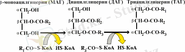 Бірінші және екінші жағдайда липопротеиндердің құрамындағы майлар ЛП - липаза көмегімен гидролизденеді және клеткаға кейін ТАГ синтезі үшін пайдаланылатын май қышқылдары түседі. Май қышқылдары ТАГ түсу үшін алдымен А коферменттерінің тиоэфирлерінің түзілу жолымен активтеледі, кейін глицеролфосфатпен әсерлеседі. Глицерол адипоциттерде фосфорлана алмайтындықтан (бұл клеткаларда глицеролкиназа болмайды), глицеролфосфат тоттықсыздануы кезінде түзіледі.