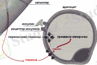 Сәйкесінше, ТАГ синтезі глюкоза бар жағдайда ғана жүзеге асады. Одан гликолиз процесінде диоксиацетонфосфат түзіледі. Инсулин ТАГ синтезін стимулдейді, өйткені ол бар ортада май ұлпалары клеткаларының мембраналарының глюкоза үшін өткізгіштігін жоғарлатады.