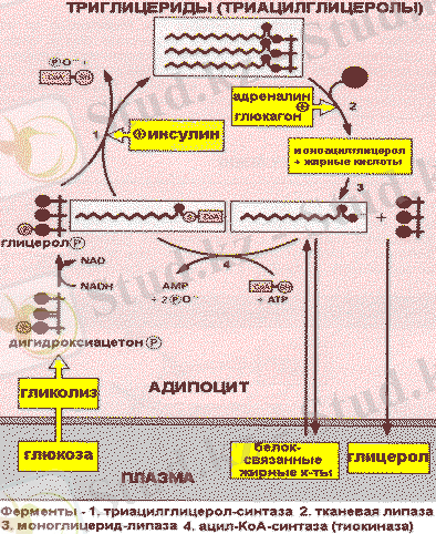 Адреналин мен глюкагон клеткаішілік липазаны активтендіреді. Бұл гормондардың әсер етуі аденилатциклаза каскадының реакциясымен опосредовано. Ол осы кезде белсенді формаға өтіп, ТАГ эфилі байланыстарды ыдырататын аденилатциклазаның активтенуінен басталып, липазаның фосфорлануымен аяқталады. Глицерол плазмада еритін зат ретінде бауырға тасымалданады, ол онда глюконеогенез реакцияларына пайдаланылады. Май қышқылдары қан арқылы комплекс түрінде сарысу альбуминімен бірге әр түрлі органдар мен ұлпаларға тасымалданады, ол онда тотығу процесіне қатысады.