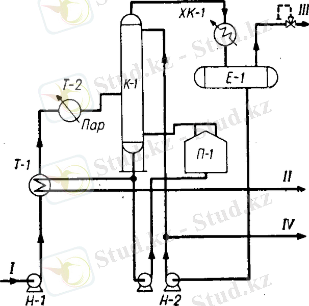 МТҚ құрылғысының сызбасы №2 суретте көрсетілген. Өндірістік сепараттау құрылғыларынан шыққан мұнай Т1 жылу алмастыру және Т2 бумен жылту құрылғылары арқылы өтеді. Т1 жылу алмастырушы құрылғыда мұнай тұрақтандырылған мұнай болып жылытылады. Жылытылған мұнай ректификациондық К-1 тізбек-сақтандырғышқа жіберіледі. Сақтандырғыштың жоғарғы жағынан шығатын көмірсутектер ХК-1 конденсатор-мұздатқышта конденсацияланады және Е-1 сыйымдылығына құйылады. Сақтандырғыштың жоғарғы жағынан С ден С ке дейінгі көмірсутектер шығады. Айналмалы өндірістік сумен салқындатқан кезде тізбектің жоғарғы жағынан щығатын өнім конденсатор-мұздатқышта түгелдей дерлік конденсацияланбайды, сондықтан Е-1 сыйымдылығында конденсатордан келген қоспа газ бен сұйықтыққа бөлінеді.