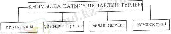 Қылмысқа қатысушылардың түрлері және олардың әрқайсысына заңдылық сипаттама ҚК-нің 28-бабында көрсетілген.