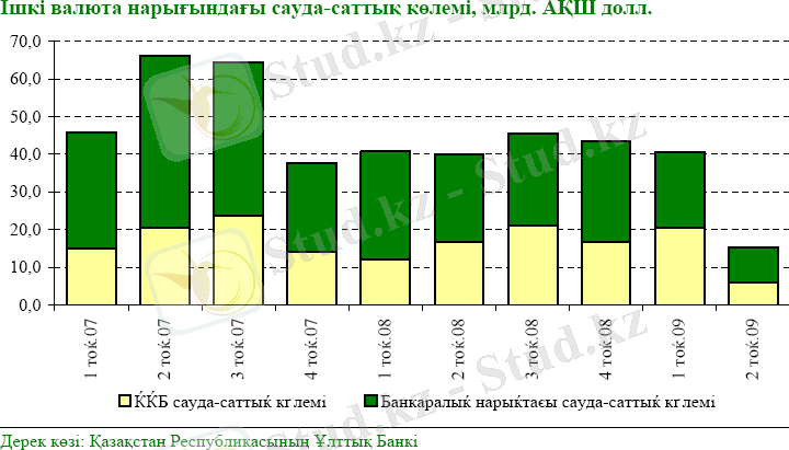 Қазақстан Қор биржасындағы долларлық позициядағы биржалық сауда- саттық көлемі 2009 жылғы 1- тоқсанмен салыстырғанда 3, 3 төмендеді және 6, 2 млрд. АҚЩ долларын құрады (Қазақстан Қор биржасындағы сауда-саттықтардың нетто-көлемі брутто-көлемінің 82% құрады. ) биржадан тыс валюта нарығындағы операциялардың көлемі 2009жылғы 2-тоқсанда өткен тоқсандағымен салыстырғанда 2, 2%-ға төмендеді және 9, 3 млрд. АҚШ долларын құрады. [11, 58б. ]