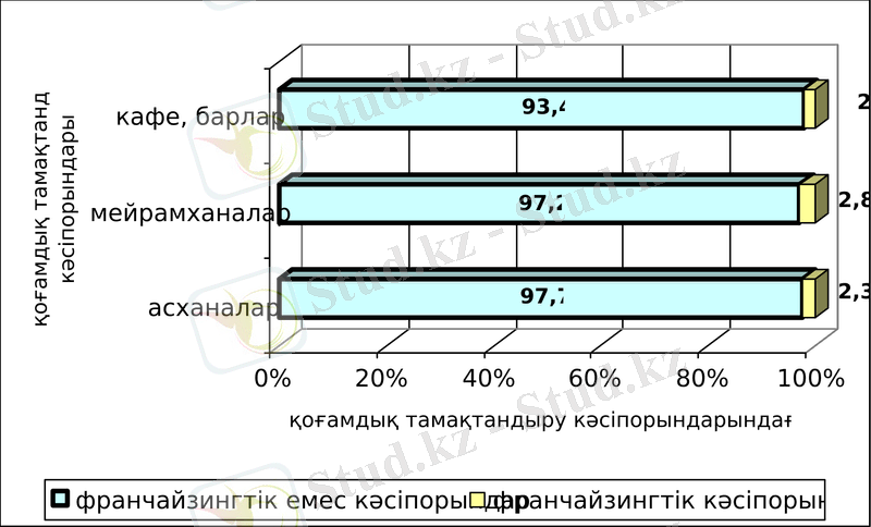 3-суреттегі мәліметтер бойынша, қоғамдық тамақтандыру саласындағы франчайзингтік компаниялардың - 2, 8 %-ы мейрамханалардың үлесінде. Бұл осы салада мейрамханалардың кеңінен таралуымен айқындалады. Ал 2, 3%-ы кафелер мен барлардың және асханалардың - 2%-ы франчайзингтік екені анықталды.