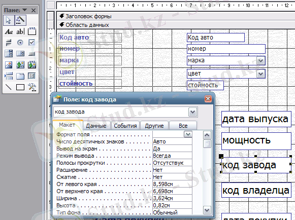 Түр - Колонтитулдар командасын орындап жоғарғы және төменгі колонтитулды формаға енгізейік. Жоғарғы колонтитулдың фон түсін жанама менюдің Бояу - фон тусі командалары арқылы өзгертеміз. Жоғарғы колонтитулға «Зауыттар жөнінде мағлұмат» деген мәтінді орналастырамыз. Осы әдіспен мәліметтер аймағының фон түсін өзгертеміз. Мәліметтер фймағына жазудың көмегімен «Зауыт аты» мәтінін орналастырып, Каріп өлшемі қасиетін 10- ға тең етіп тағайындаймыз. Бұдан кейін керекті өрісті кесте құрылымынан, мысалы, «Зауыт аты» деген өрісті жазба түсына орналастырамыз. «Мәліметтер» парақшасында Мәліметтер өрісі қасиеті үшін тізімнен керекті өріс атын таңдаймыз. Содан соң «Барлығы» парақшасында Қаріп өлшемі қасиетін 10 - ға тең етіп орнатамыз. Аталған іс - әрекеттерден кейінгі форма түрі 3 - суретте көрсетілген. Сонымен бірге суретте Өріс парақшасының қасиеттер тетезесі көрсетілген.