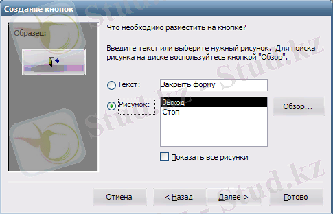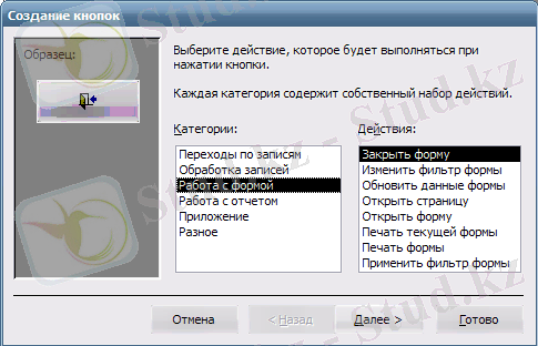 Одан кейін «Директор аты - жөні» жазуын орналастырып, ол үшін Қаріп өлшемін 10 - ға тең етіп тандаймыз. Аспаптар тақтасындағы «Батырма» аспабын тандып, оны формаға орналастырамыз. «Батырманы» формаға орналастырғаннан кейін оңың өлшемі мен орнын өзгертуге болады. «Батырманы» формаға орналастырған кезде сұхбаттасу терезесі ашылады. Бұл терезеде батырма үшін оның атқаратын іс - әрекетін анықтауға болады, мысалы «Формамен жұмыс» іс - әрекетін тандаймыз (5-сурет) . Сұхбаттасу терезесінің келесі қадамында (6-сурет) батырмада сурет немесе мәтін болатындығын анықтау керек. Егер бар суреттерді қарау керек болса, «Барлық суреттерді қарау» жалаушасын белгілеу қажет, осылай суреттерді көре отырып, қажеттісін тандаймыз.