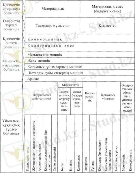 Межелеудің ең жалпы белгісі кәсіпорындар мен ұйымдарды қызмет сфсраларының біріне - матсриалдық немесе матсриалдық емес (өндірістік смес) сфераға жатқызу болып табылады. Қызметтің материалдық сферасының кәсіпорындары бүкіл қоғамның тіршілік әрекетінің негізі болып табылатын материалдық онімдер мен игіліктерді жасайды. Бүл сферада жасалған онімнің бір бөлігі оның салалары ішінде (өндірістік тұтынудың онімдері) тұтынылады, басқа бөлігі түпкілікті тұтынуга, соның ішіндс өндірістік емес сфераға да бағытталады. Өндірістік емес сфера қызметінің нәтижелері қызмстгердің нысанын қабылдайды, қызметтерді жасаудың процесі, әдеттегідей, оларды тұтыну процесімен тоқайласады, яғни олар қордалауға, сақтауғажатпайды.