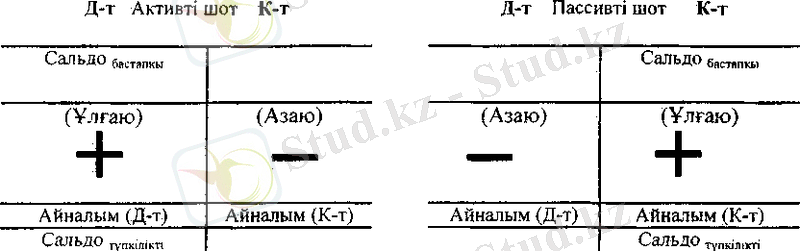 Активті шоттардағы қалдық - дебеттік, пассивтіктегілер - кредиттік. Активті шоттардың ұлғаюы дебет бойынша, ал азаюы - кредит бойынша Пассивті шоттардың ұлғаюы кредит бойынша, ал азаюы - дебет бойынша жазылады.