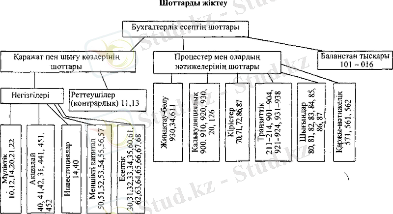 Шоттарды жіктеу бухгалтерлік есеп тәсілінің маңызды элементі ретінде шоттар жүйесін сипаттайды, қаражат пен шаруашылық процестерін жүзеге асыру үшін оларды дұрыс колдануға мүмкіндік береді. Бухгалтерлік есепте қолданшатын шоттар оларда есепке алынатын объектілердің экономикалык мәні жағынан, міндеті, құрылымдық ерекшеліктері және тағы басқа белгілері бойынша бірдей емес. Осыған байланысты оларды сапалық біртекті топтарға бөліп жіктеу, топтастыру талап етіледі, бүл шоттардың әрбір жекелеген топтарына тән ерекшеліктерді анықтауға, олардың мазмұны мен есепте қолданылу тәсілдерін түсінуге мүмкіндік береді.