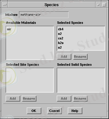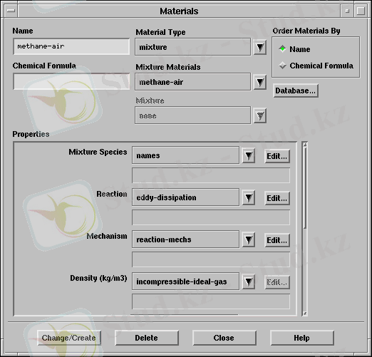 Materials (Материалдар) панелі Species Model панелінен таңдап алынған methane-air материалдар қоспаларын көрсетеді. Қоспалар құрамы FLUENT мәліметтер базасынан көшіріліп алына алады және сіздің қалауыңыз бойынша өзгертуге болады.