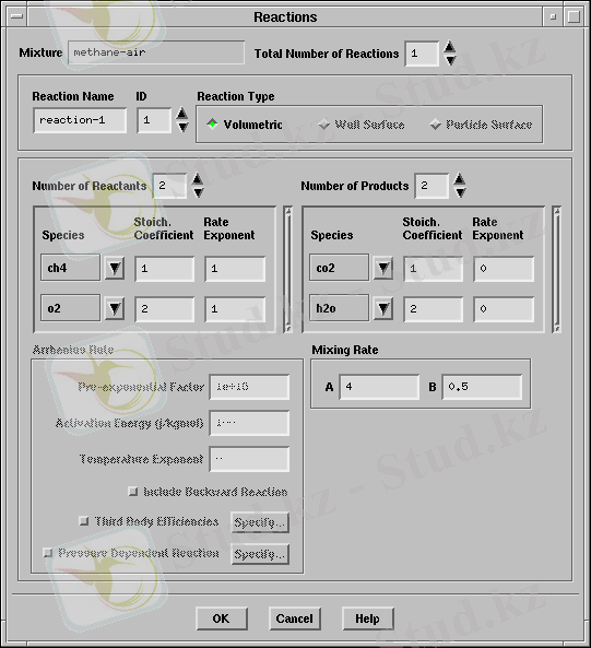 Алдын-ала сіздер бірінші бөлім және Fluent бағдарламасының меню құрылысымен жақсы таныс деп алайық. Шешім табу мен жөндеу (настройки) процедураларындағы бөлек қадамдар толық қарастырылмайды. Химиялық реакциялар көмегімен модельдеу туралы толық және қажетті ақпаратты Қолданушының Қолдану Кітапшасынан таба аласыз.