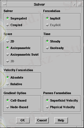 1. Оське қарасты симметрия түрінде облысты анықтаңыз және таңдалған бөлек шешушіні (segregated solver) қалдырыңыз.