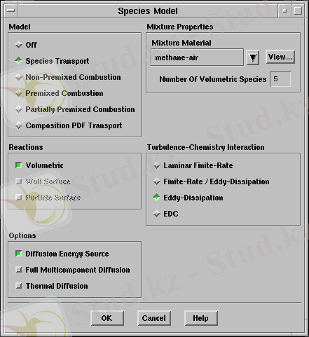 (d) Turbulence-Chemistry Interaction (Турбулентті-химиялық өзара байланыс) жазуының астыңғы бөлігінен Eddy-Dissipation (Вихрлік диссипация) таңдап алыңыз. Вихрлік турбулентті модель реагенттердің араласу жылдамдығына қарағанда реакция кинетикасы жоғары деп қарастыратын реакция деңгейін есептейді.