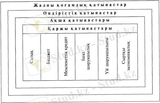 Қатынастардың иерархиялық субординациясын ескере отырып, "жалпьщан - жекеге" қағидаты бойынша олардың мынадай дәйекті қатарын жасауға болады: жалпы қоғамдық қатынастар, өндірістік қатынастар, ақша қатынастары және қаржы қатынастары (салық, бюджет, мемлекеттік кредит, сыртқы экономикалық қатынастар және т. б. )