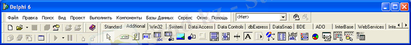 Экранның жоғарғы бөлігінде негізгі терезе орналасады. Онда құрал-саймандар тақтасы (Standard. View. Debug және Custom) және компоненттер палитрасы орналасады. Негізгі терезе Delphi 6 ортасы жабылмайынша ашық тұрады. Негізгі терезені жабу арқылы Delphi 6 -ны жабамыз.