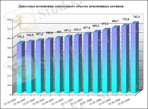 ҚР-ның қаржы нарығын және қаржылық ұйымдарды реттейтін және бақылайтын Агенттігінің мәліметтері бойынша 2006 жылдың 1 шілдесіне қарай елдегі зейнетақы активтері (есептелген сыйақылар бойынша, зейнетақы төлемдері бойынша кредиторлық міндеттемелерін қоспағанда) 770 825, 7 млн. теңге құрады, оның 764 282, 1 млн теңге инвестицияланды. 2006 жылдың 1 маусымына қарай салыстырмалы көрсеткіш - 757 399, 0 млн теңге. ҚР-ның жинақтаушы зейнетақы қорларының зейнетақы активтері ырғақты өсуде және соңғы 2, 5 жыл ішінде олар екі еселенді. (2, 0 млрд АҚШ доллардан 4, 1 млрд. -қа дейін) .
