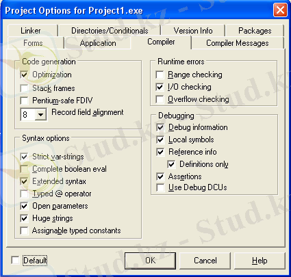 Программаның синтаксистік түрде жазылуы дұрыстығын компилятордың өзі қадағалап отыруы және терезесін экранда көрсету үшін әдетте Delphi орнатылған соң ол күйге келтіріліп қойылады. Оның бірі - Project - Options (проект -күйге келтіру) командасын беріп, ашылған терезенің Compiler бетіндегі жазуларды 2. 21 - суреттегі сияқты орнатып қою керек.