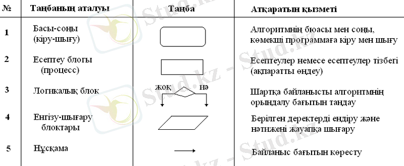 Блок-схема пайдаланылатын геометриялық фигуралар блогтық-таңбалар, ал байланыс-нұсқамлара ағын сызығы деп аталады. Ағын сызығы фигурадан фигураға өту жолын көрсету, яғни ақпараттарды және мәліметтерді өңдеудің ретін көрсету үшін пайдаланылады.