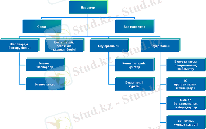 Компанияны директор басқарады. Ол барлық бөлімнің жұмысын бақылайды. Көптеген ірі кәсіпорындармен және банктермен келісім шарт жасасады.