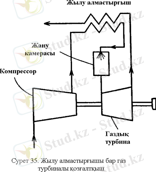 35-суретте жылу алмастырғыштың жұмыс принципі түсіндірілген. Бұл суретте салынған газ турбиналы қозғалтқыштың схемасы 4-суреттегіден әлдеқайда күрделі болып табылады. Бұл схема бойынша, ауа кіру құрылғысы арқылы компрессорға өтеді де, сығылғаннан кейін жылу алмастырғышқа бағытталады. Жылу алмастырғышты ортақ корпуста орналасқан, ұштарымен пластиналарға бекітілген өте көп жұқа қабырғалы металдық трубкалардан тұратын ерекше радиатор түрінде қарастыруға болады. Сығылған ауа жану камерасына бара жатқан жолда осы трубкалардан өте отырып, трубкалардың бетімен ағып жатқан пайдаланылған газдардың жылуы есебінен қызады.