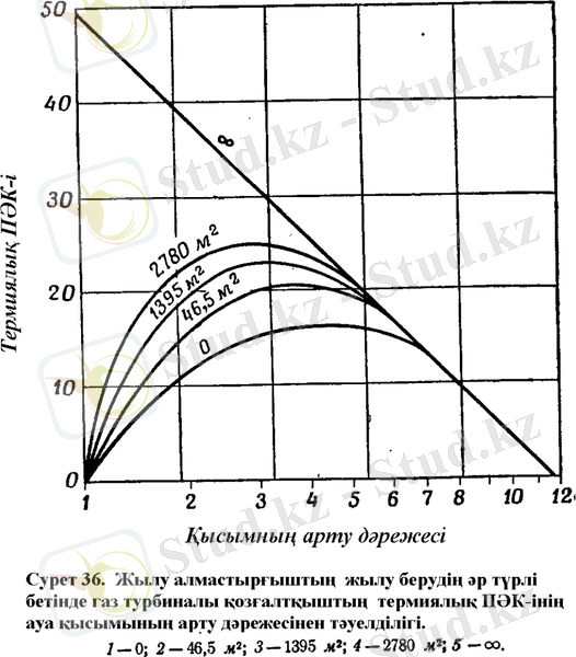 36-суретте қозғалтқыштың толық ПӘК-інің компрессордағы ауа қысымының арту дәрежесі мен жылу алмастырғыштың қыздыру бетінен тәуелділік графигі келтірілген. Әр қисық жылу алмастырғыштың белгілі бір жылу берілу бетіне сәйкес келеді. Графиктен көрініп тұрғандай, жылу алмастырғышсыз жұмыс кезінде (қисық 1 ), қысымды арттыру дәрежесі 5-ке тең болғанда қозғалтқыштың максималды ПӘК-і шамамен 0, 165-ті құрайды. Жылу берілу беті артқан сайын ПӘК-і де арта береді. 2, 3, және 4-қисықтар үшін ПӘК-інің мәндері сәйкесінше 0, 21, 0, 23, 0, 255-ті құрайды, және де бұл мәндерге қысымды арттыру дәрежесі 3, 8, 3, 2, 2, 9-ға тең болғанда қол жеткізіледі.