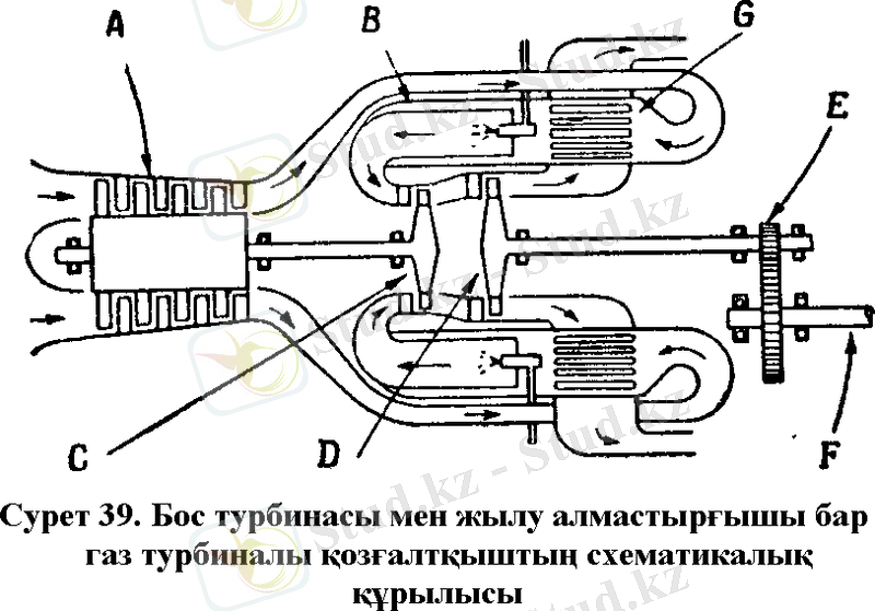 Автомобильді көлік пен басқа да шағын газ турбиналы қозғалтқыш қолданылуы мүмкін салаларға арналған бос турбинасы мен жылу алмастырғышы бар газ турбиналық қозғалтқыш құрылысы 39-суретте көрсетілген [27] . Қозғалтқыш жылу алмастырғышқа G сығылған және қыздырылған ауа жеткізіп отыратын осьтік компрессордан А тұрады. Жылу алмастырғышта ауа одан әрі қыздырылып, жану камерасына В түседі де, ол жерден артық қалған ауамен сұйылтылған жану өнімдері компрессордың турбинасына С, одан кейін күштік турбинаға D түседі. D турбинасынан кейін пайдаланылған газдар жылу алмастырғыш арқылы өтіп, атмосфераға шығарылады.