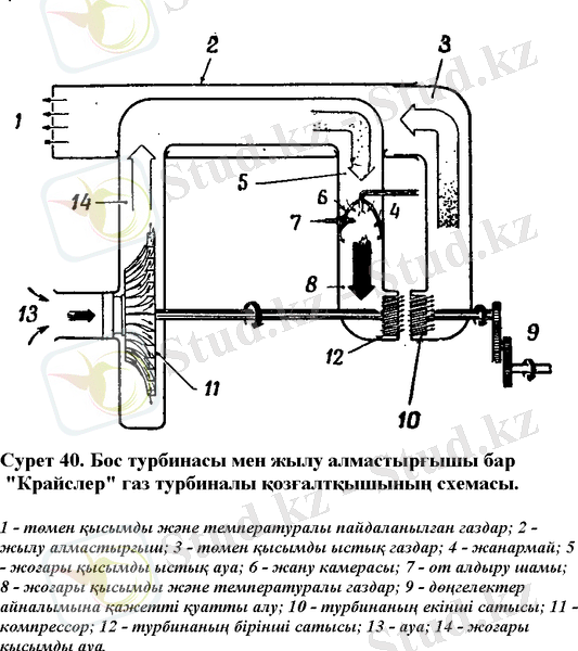 40-суретте жылу алмастырғыш немесе «Крайслер» фирмасының ертеректегі автомобильді газ турбиналы қозғалтқыштарда қолданылған регенератор схемасы көрсетілген. Жоғары және төмен қысымды газдар ағынының бағыты схемада тілшелермен белгіленген. Бұндай қозғалтқыш бос турбинасы бар қозғалтқыштар класына жатады, және де бұл жағдайда турбинаның екінші сатысы өз қуатын сыртқы тұтынушыға беретін күштік болып табылады.