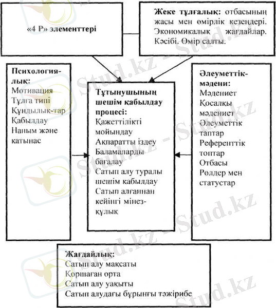 Маркетинг-микс факторлары сатып алу туралы шешімге әсер ететін күшті ынталандырушы болғанымен, тұтыну-шының соңғы таңдау жасауына жеткіліксіз болып табылады. Бүдан басқа оған психологиялық, әлеуметтік-мәдени, жеке тұлғалық және жағдайлық факторлар әсер етеді.