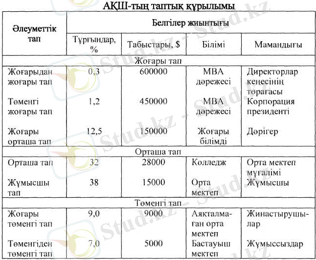 3. Әлеуметтік таптар - қоғам шеңберінде сатылық тәртіппен орналасқан салыстырмалы тұрақты адам топтары. Сол немесе өзге әлеуметтік тапқа жатуы әрқашан сатып алушылық таңдауға әсер етеді. Адамдардың белгілі бір әлеуметтік тапқа жататынын анықтауда жиі қолданылатын өзгермелілерге табысы, байлығы, білімі, түрғылықты меке-нінің көлемі мен орны, меншігі, айналысатын ісі жатады. Қазақстан Республикасы халқының нақты білімі, табысы және жүмысқа қамтылуы жөнінде мәліметтер болмауы себепті әлеуметтік жіктеу (стратификация) жүргізілмеген. Сондықтан да бүгінгі Қазақстанның таптық қүрылым үлгісі жоқ. Осы тақырыпты түсіндіру үшін, АҚШ зерттеушілері Колеман мен Рейнуотер ұсынған Американың таптық қүрылымының сипаттамасын қарастырып көрейік (35, 45-6) .