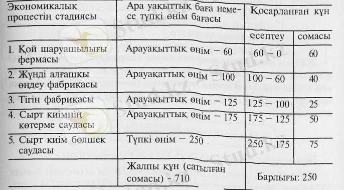 Өндіріс процесінің бес сатылық жағдайь, ндағы қосарланған құнның және сырт киімді еткеруді есепт еудің мысалы (долл)