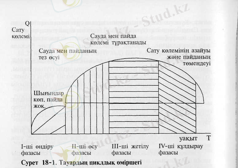 Өнімді жоспарлау процесіңде жаңа тауардьщ нарыкга пайда болуын анықтау өте маңызды. Мүны анықтауға тауардың циклдық өміршеңдігі көмектеседі. Тауардың циклдық өміршеңдігіне сатушының әрбір төрт фазадағы (стадия) пайда денгейі тікелей тәуелді: а) нарыкка тауарды ендіру; ә) сату көлемінің есуі; б) жетілу фазасы; в) күлдырау фазасы. Тауардың циклдық өміршендігінің типтік моделі график түрінде 18-1 суретте бейнеленген: