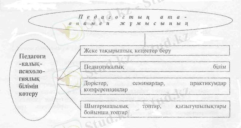 Педаготтын ата-аналармен жұмысынын мазмұнын төмендегі сызбадан көруге болады.