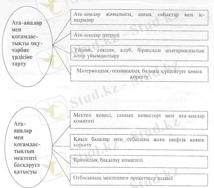 Ата-аналарды оқу-тәрбие үдерісіне төмендегідей әрекеттер арқылы тартады: