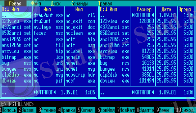 Екi панельдің әр қайсысының құрамында дисктегi каталогтың мазмұны (оглавление) немесе жадының орналастрылуы туралы бiрiктiрiлген мәлiмет (сводная информация) болады. Файлдардың аттары каталогтың бастамасында жолдық (строчные) әрiптермен жазылады, ал каталог пен подкаталогтардың аттары - бас әрiптермен.