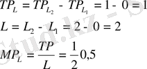 Бұл кестеде берілгендер бойынша еңбектің орташа және шекті өнімділігін анықтайық. Мысалы, екі еңбек күшін пайдаланып өнім өндіргенде жалпы өнім саны ТР=1 дана болады. Ал еңбектің орташа өнімділігі: