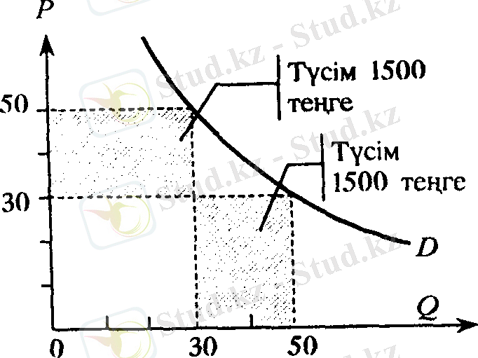 Бұл графикте сұраныс көлемі бағаның өзгеруіне сезімталдықпен жауап беріп тұр. Бағаның 50 теңгеден 30 теңгеге дейін төмендеуі сұраныс көлемін 30 данадан 60-ға дейін көбейіп тұр.