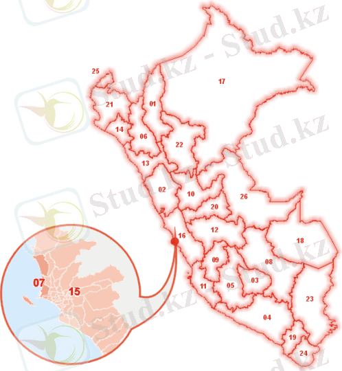 Географиясы . Батыста, Тынық мұхитының жағалауында жағалау жазықтары (Коста) созылған. Шығысында Анд (Сьерра) тау белдеуі, биіктігі 6768 м (Уаскаран тауы) . Шығсында Амазонка жазығы (Сельва), ол тау алды жазығына (Монтанья) жалғасып жатыр.